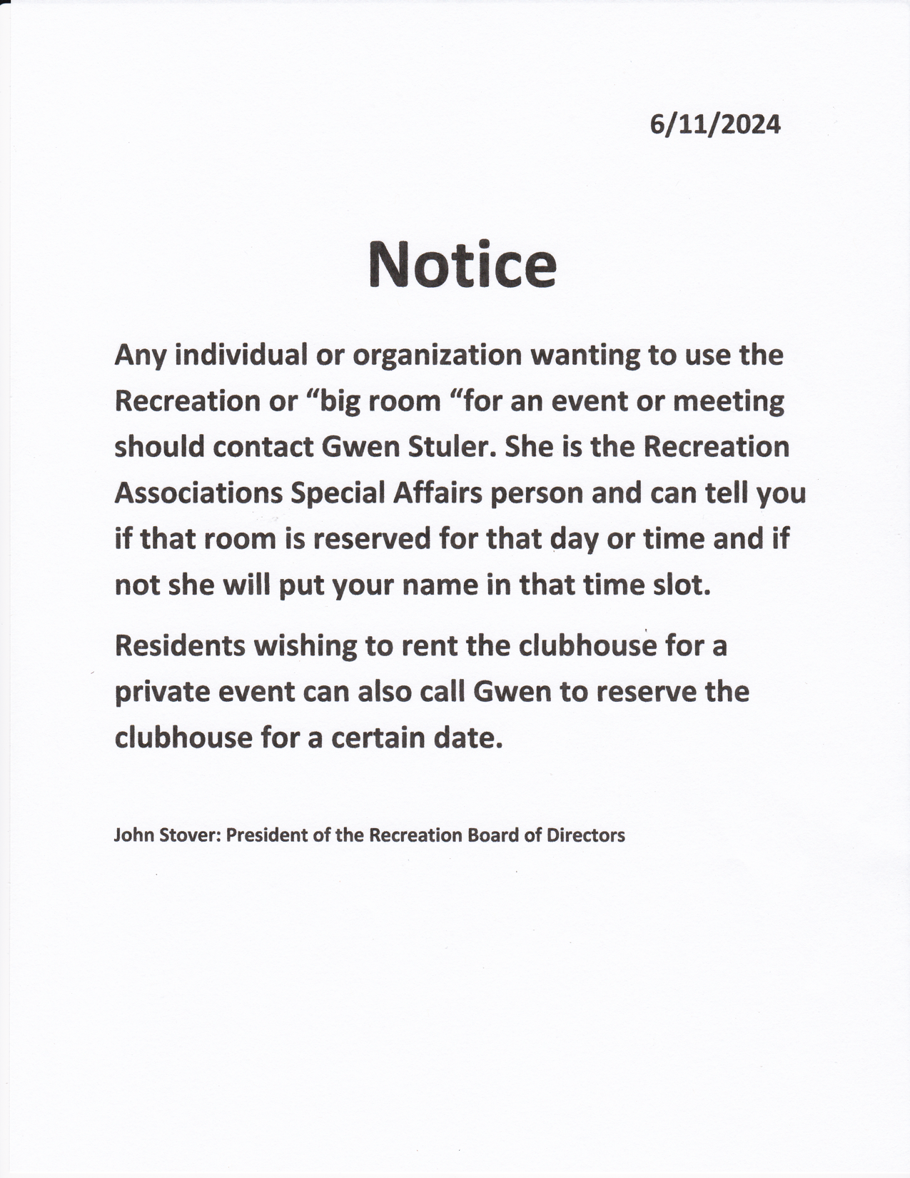 As we leave 2020 and enter into 2021 nothing has changed concerning the Board’s decision not to have any scheduled events or the renting out of the clubhouse.