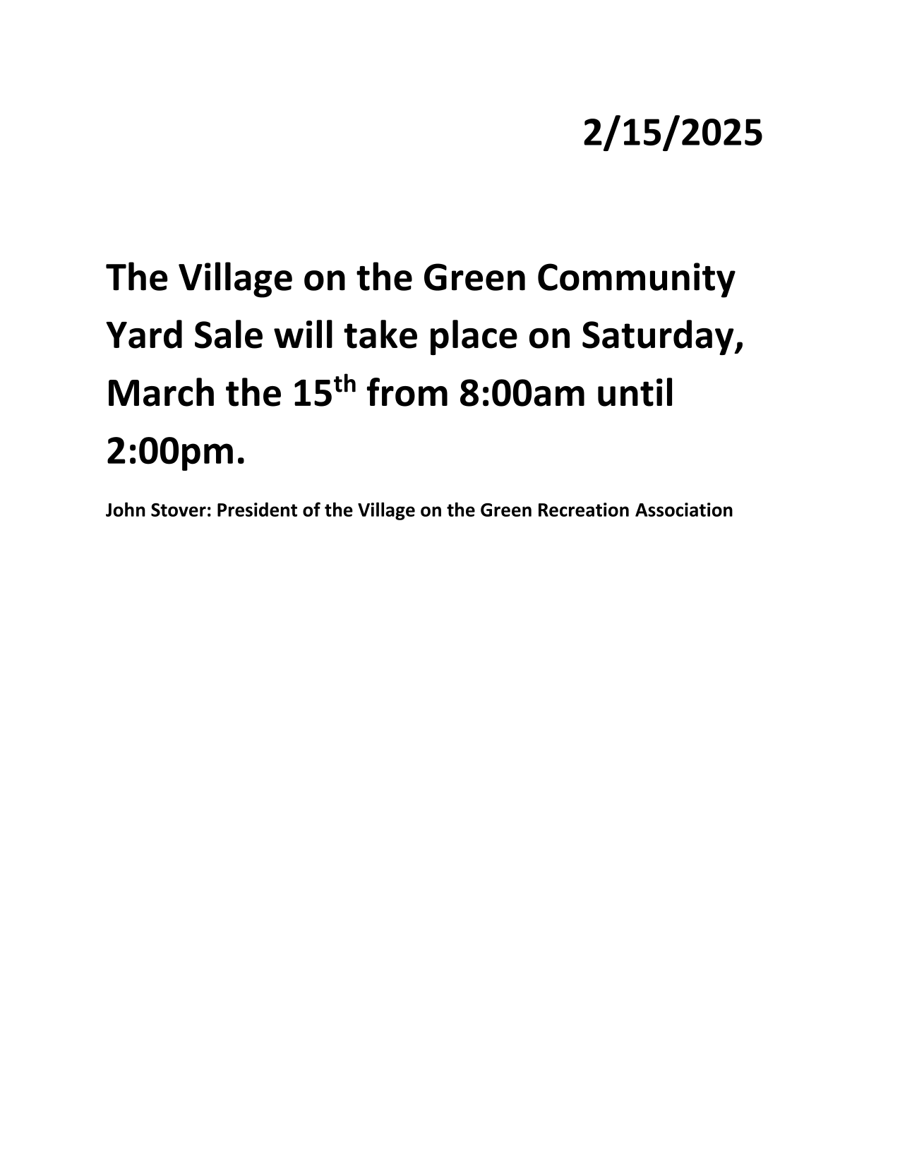 The Village on the Green Community Yard Sale will be held on Saturday, March the 16th, from 8:00 AM until 2:00 PM.